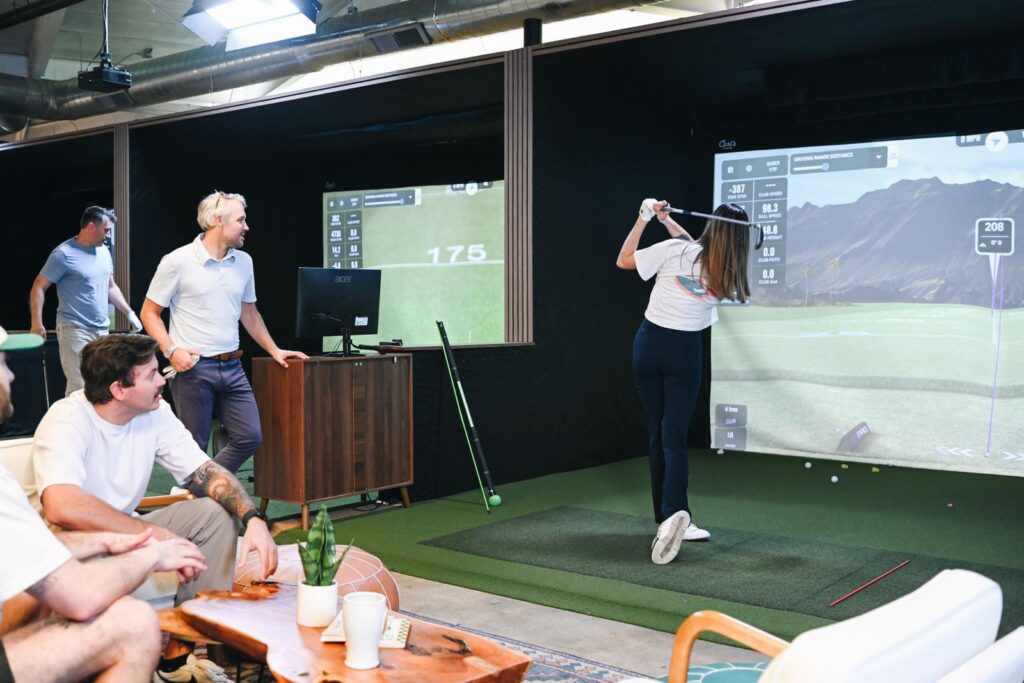There are multiple simulators, a putting green, a bar and lounge, locker rooms, soundproof conference rooms that have turned into workstations and even a soundproof phone booth to make and take business calls. Lessons are available from two coaches: Michael Evans, PGA, and Sara Camarena, who is a content creator and the winner of the 2020 California Women’s Amateur Championship.